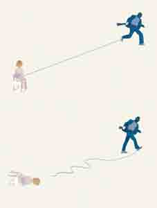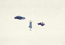 The artists knew that any extensive journey across Macedonia would require passing through regions where they would be at risk, particularly in those restricted areas in the southwest where the armed conflict between government forces and the Albanian formation so-called National Liberation Army surfaced in 2001 and remained unresolved. Six months before the artists embarked, with the crisis still evolving, they began a series of drawings that would serve not only as emotional and preparatory studies for their trip but as a possible surrogate for the journey itself. The six large-scale works that resulted can thus be read as an attempt to choreograph a fictional passage through perilous territory. Precisely outlined in pencil and accented with the spare application of color, the style suggests techniques found in schoolbooks of the 1970s. Remaining clearly identifiable as themselves, the artists are also careful to allow their characters, frequently masked or seen from behind, to read as neutral, anonymous figures onto which viewers might project their own fears and longings in a climate of mounting political confusion.